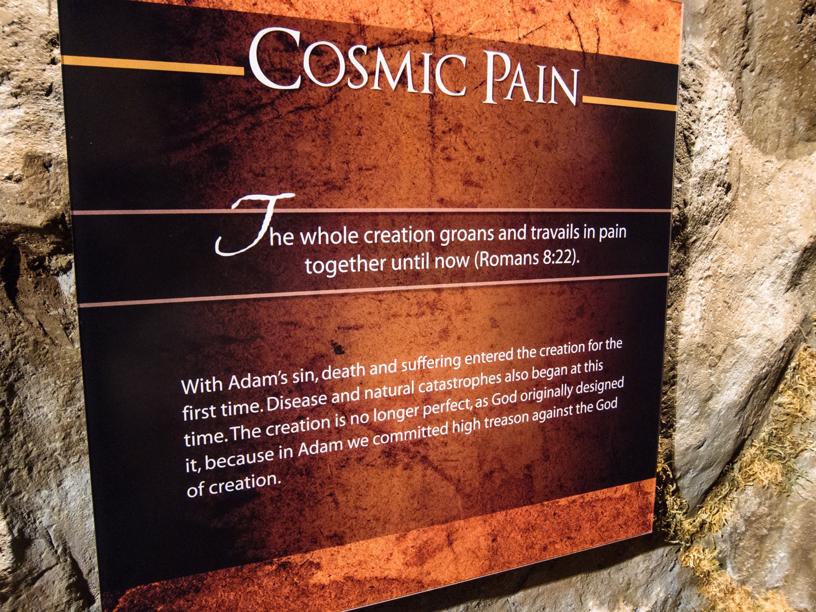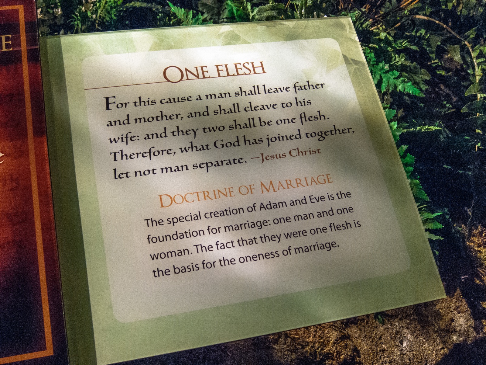 At the end of Part One we were learning how evil the world is because we have abandoned God. Abandoning God, so far as the museum is concerned, means abandoning the idea that every word in the Bible is literally true. Even if you’re Christian, if you don’t accept this, you might as well worship Satan. The museum attempts to reconcile the things we can see and know to be true with the literal words of the Bible. And, when we get into the nitty-gritty of the Garden of Eden, things inevitably get a little strange.