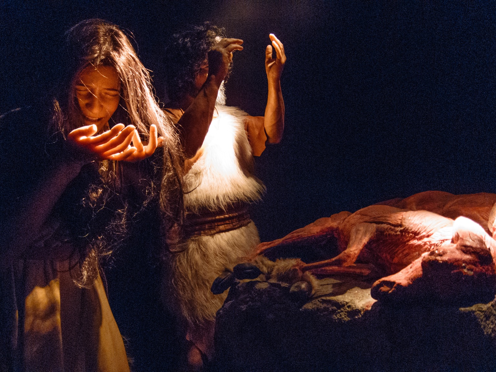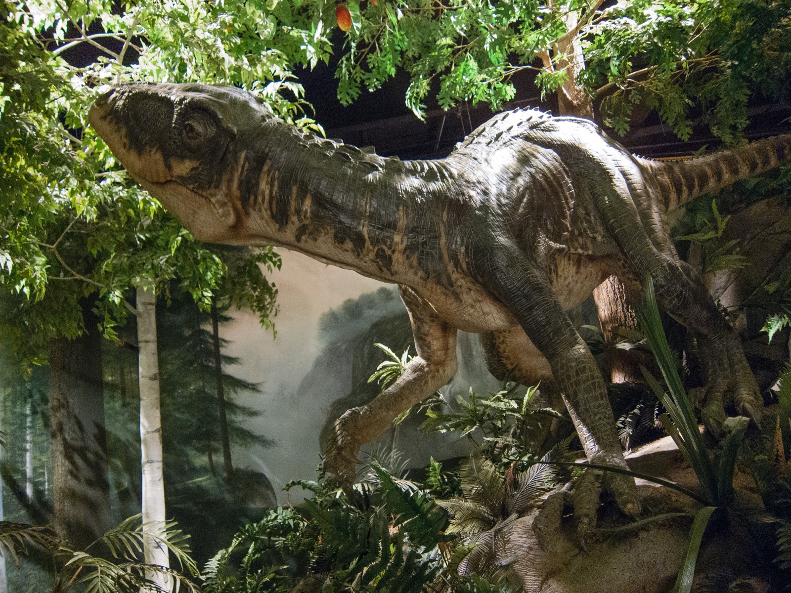 Here, a dinosaur relishes its kill. This exhibit is robotic: the dinosaur moves around and scares the children. Eeek!