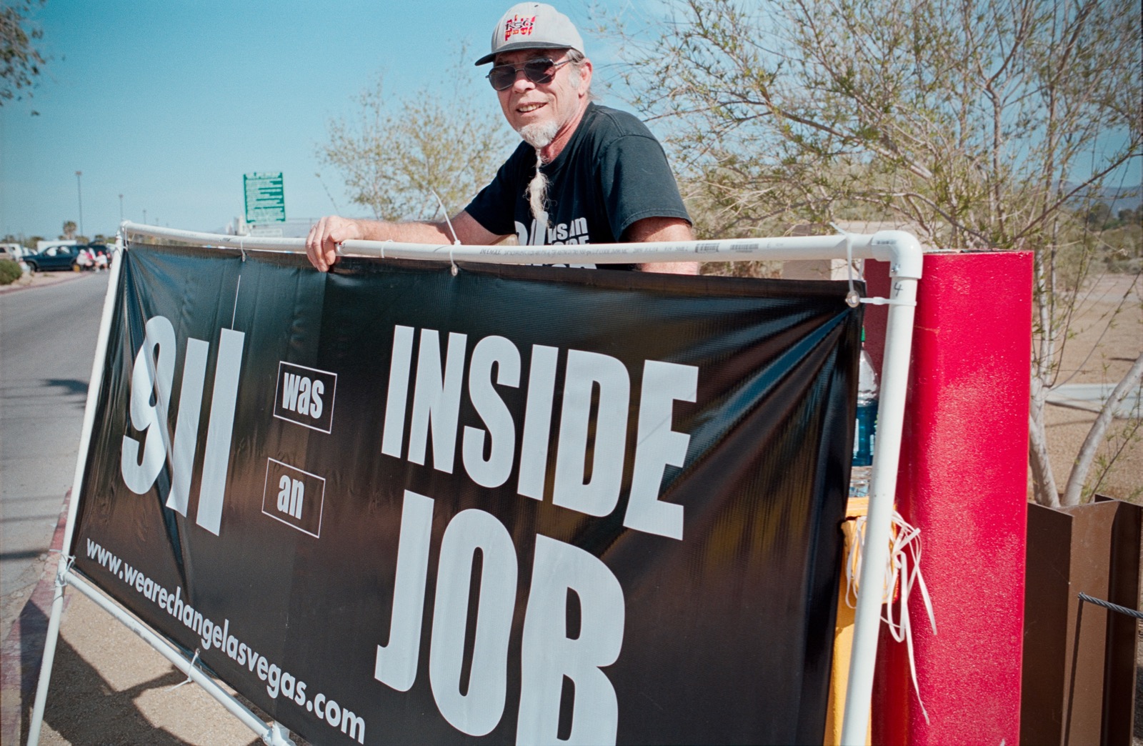 In my last post, I showed you my favorite pictures from the Tax Day Tea Party event in Las Vegas. This is my favorite person I met there. He was sitting off in the corner, near the park entrance, with his big sign: “9/11 Was An Inside Job.”