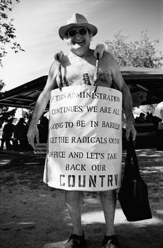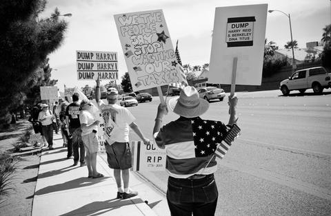 But look at the sign on the right in this picture. It calls out three “bums” to “throw out”: Harry Reid, Shelley Berkeley, and Dina Titus, Democrats all. They apparently don’t want to dump Republican Representative Lee Terry from Nevada’s 2nd District, nor even Republican Senator John Ensign, despite his ethical and legal entanglements.