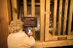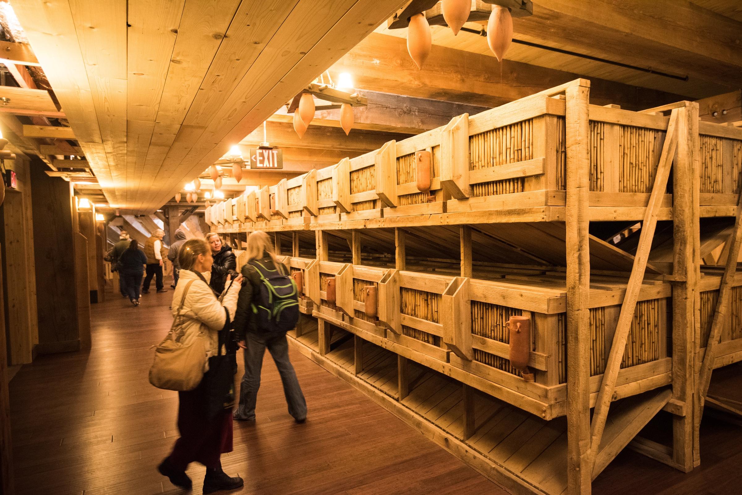Well, no—it all starts with a large room on the lower deck, full of stacks of small crates with watering and feeding devices on the front. This is where the small animals were stored. I walked in and was immediately assaulted by a cacophony of animal howls, hoots, calls, growls, squawks, and so on. Alas, these are mere recordings: the crates are empty, only for show. You may have read that AiG planned to include real animals on the Ark, but that didn’t pan out—mercifully so, for it would be cruel to confine that many animals in these crates just to prove a point. Oh, and it would have smelled.