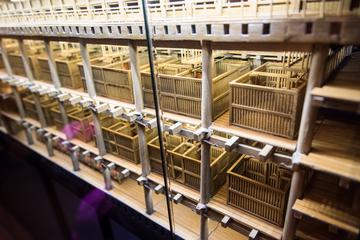 The small-animal crates were equipped with slotted floors. Angled trays beneath each crate funneled the poop into trays at the bottom of each stack, to be cleaned by the overworked crew.