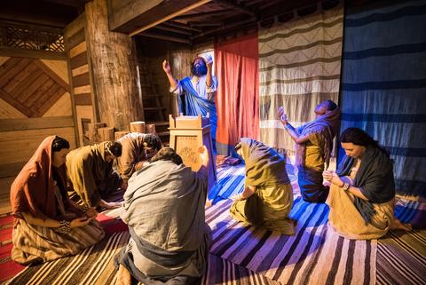 In a large room at one end of the ship, a video plays on a loop: The Noah Interview. A hot tabloid reporter (they had tabloids before the Flood, naturally) has come to interview the old man building a giant ship with no sails or oars, miles from any water. She’s made up to look as “bad girl” as possible, with the makeup and the leather and the vaguely Cockney-ish accent, and she’s there to make Noah look like a fool, her hunky, tattooed scribe and illustrator in tow. Noah endures her snotty attitude, silly questions, and hammy overacting, trying to explain that God told him to build a giant ship and is going to kill everyone.