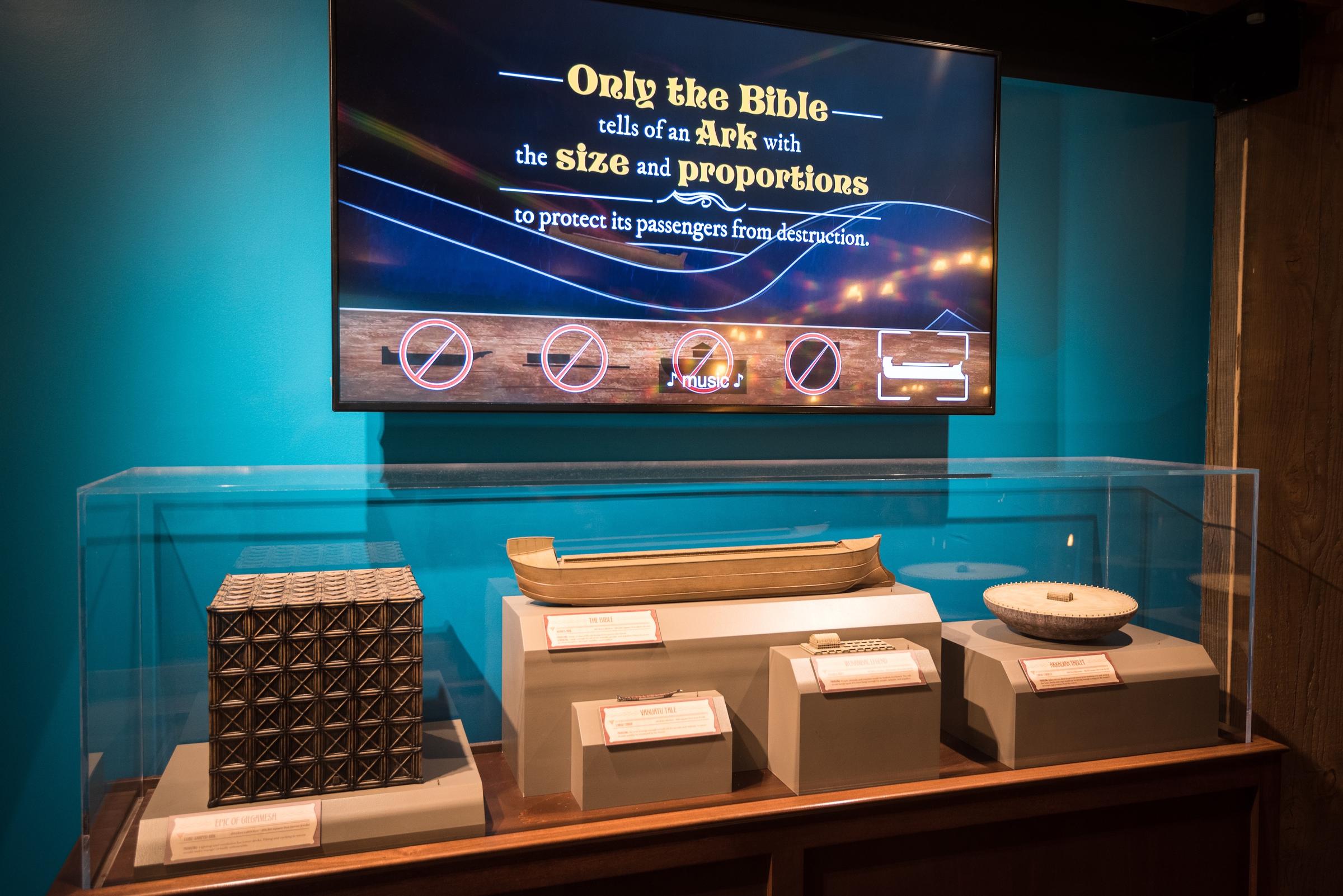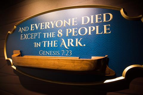 “Fairy tale ark stories often focus on cute animals and a fun boat ride,” the display tells us. “But the Flood account is about the righteous and holy God judging an exceedingly sinful world with a cataclysmic Flood while showing mercy to Noah’s family and the animals.”