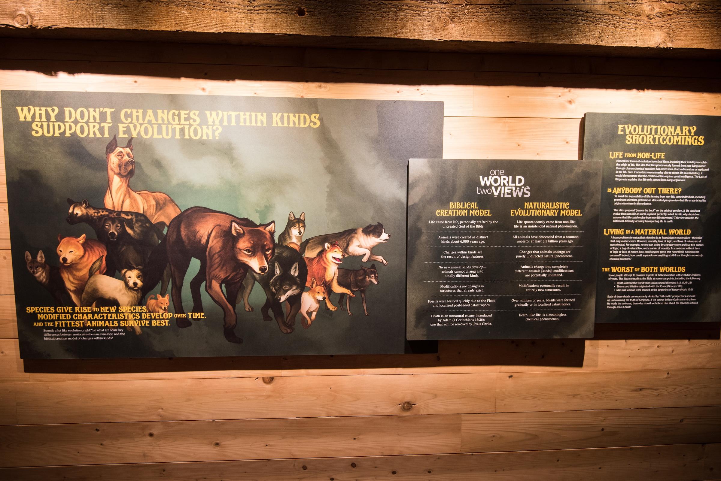What of all those people—those Christians—who believe evolution is simply how God created everything? That the Genesis story is a simplification, an allegory, and all these animals are indeed God’s creation with evolution as his tool? Well, they’re just wrong, not really Christian, and I guess they’re going to Hell. See, if God had done it that way, that’s what the Bible would say; it doesn’t say that, so it didn’t happen. One of the displays actually includes the statement: “If we cannot believe God concerning how He made the universe, then why should we believe Him about the salvation offered through Jesus Christ?” (The question is not answered.)