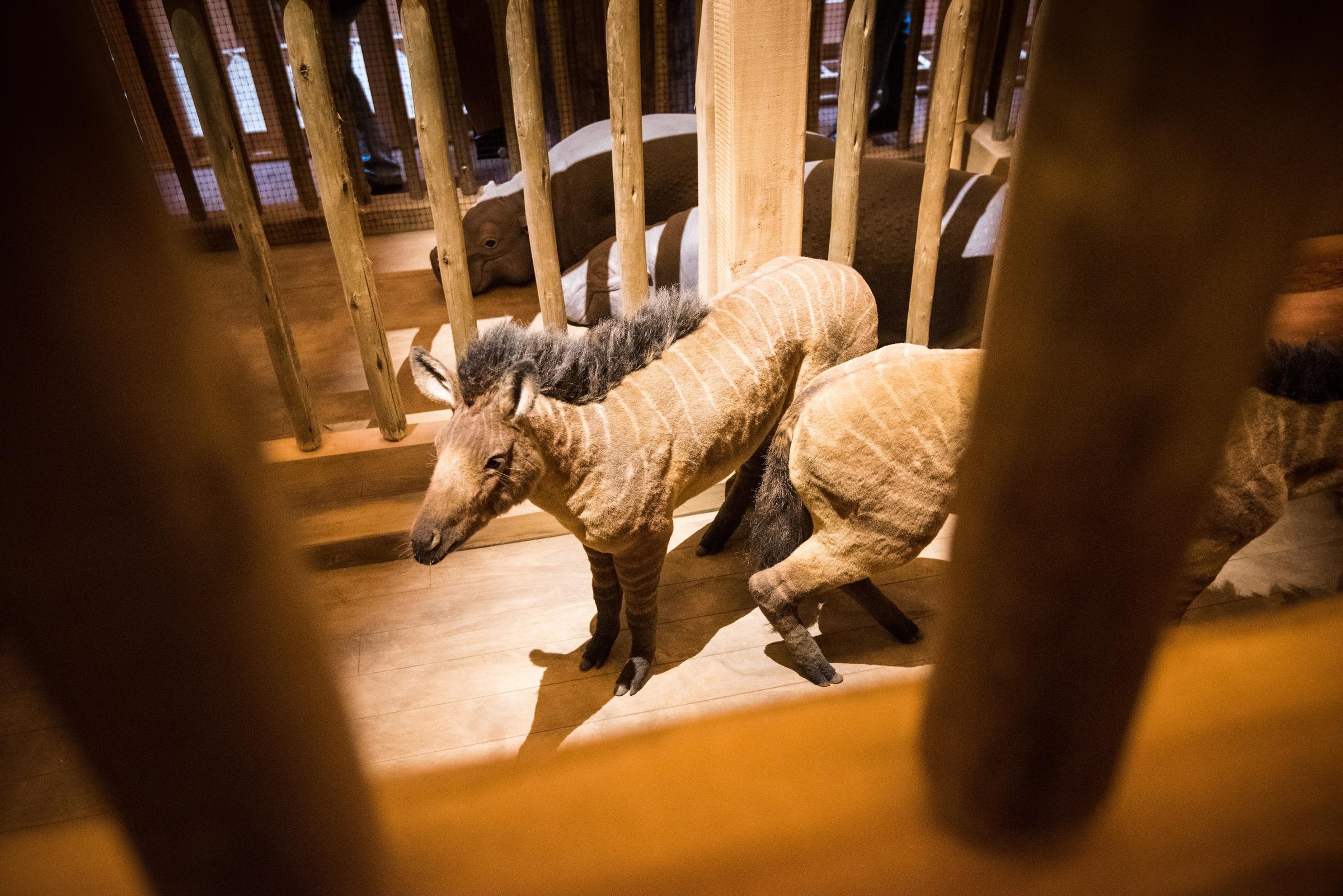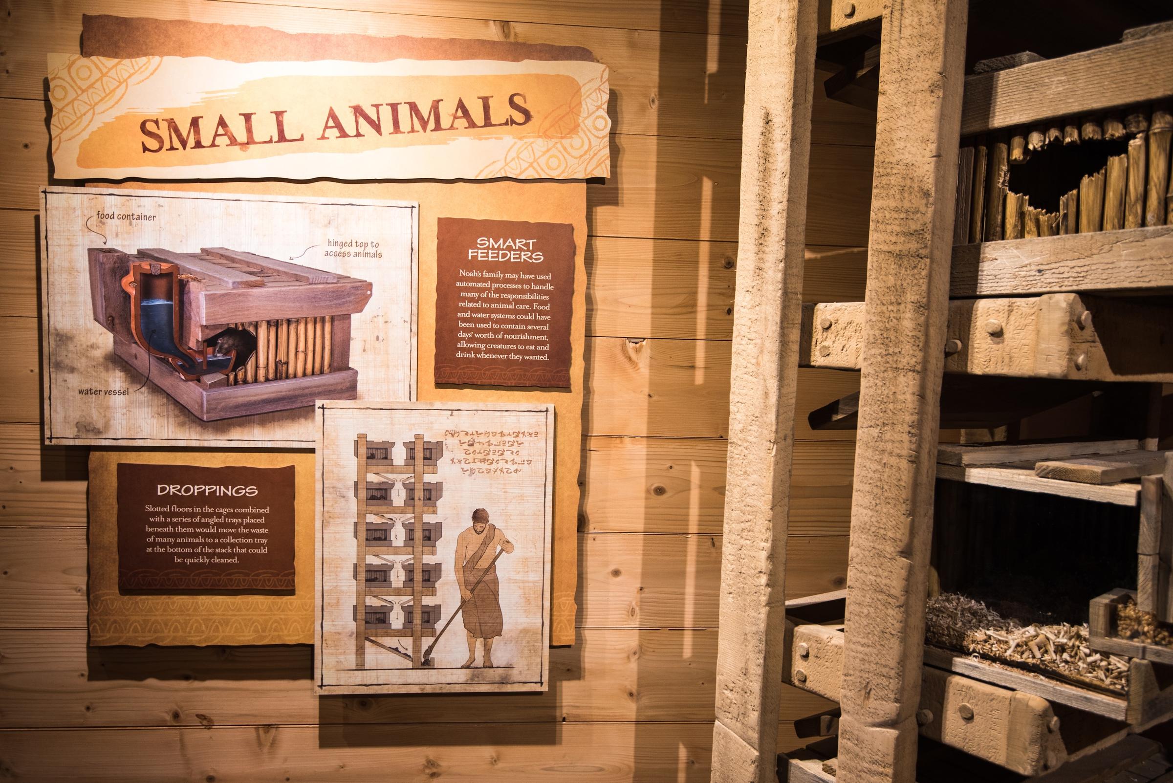 The result of this funny math is that we only need to fit about 6,700 animals on the Ark. Each of the large cages, with stuffed animals inside, is labeled with the “kind” it represents. Some of these are animals we know and love, and some are now extinct, but most are said to be ancestors of several of what we know as species.