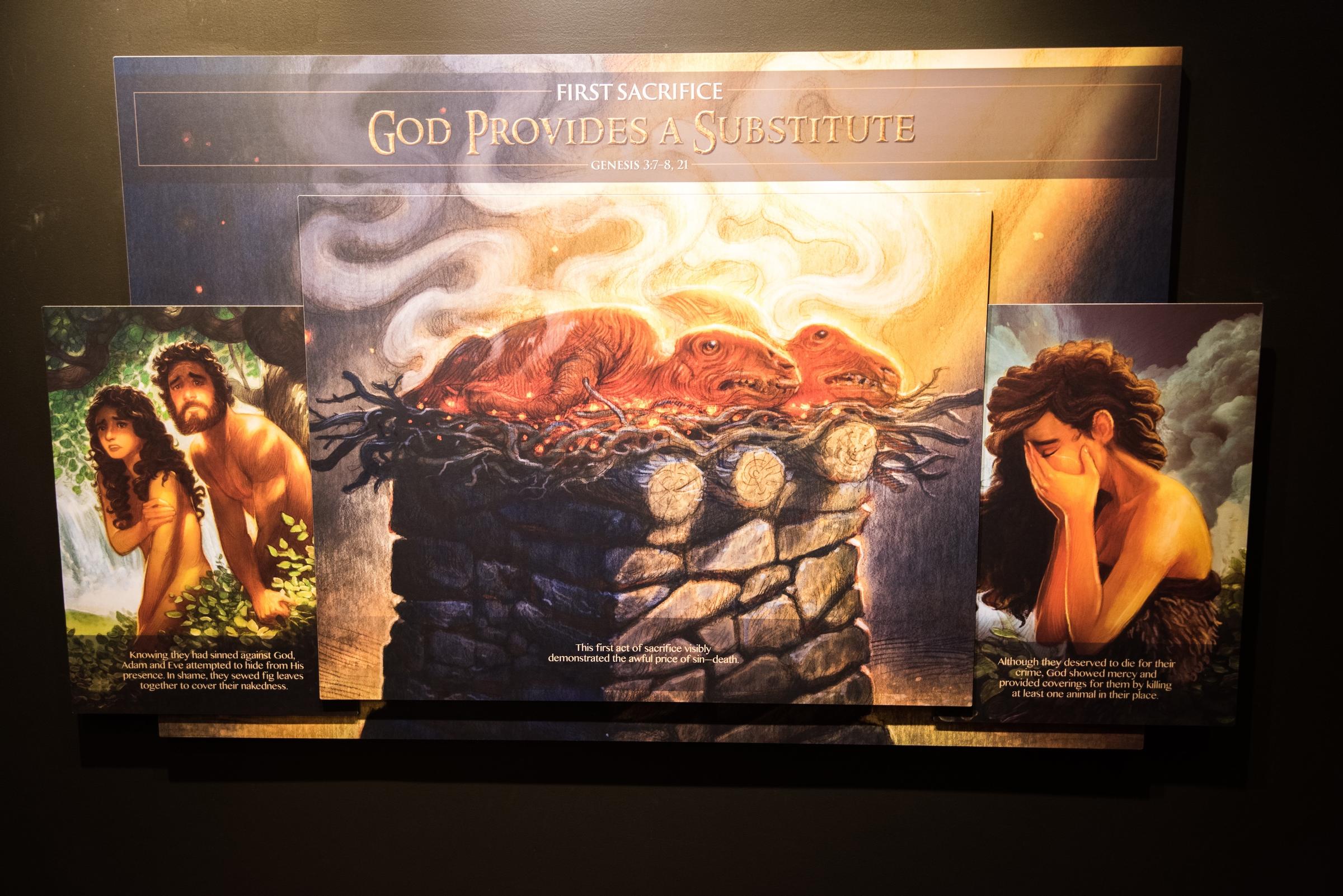 “Although they deserved to die for their crime,” the display explains, “God showed mercy and provided coverings for them by killing at least one animal in their place.” That’s right: for eating the wrong food, they deserved to die. Those who later perished in the Flood deserved their fate, as well. We all deserve to die, the Ark teaches us, because we are all sinners. Such a fun day out with the kids!