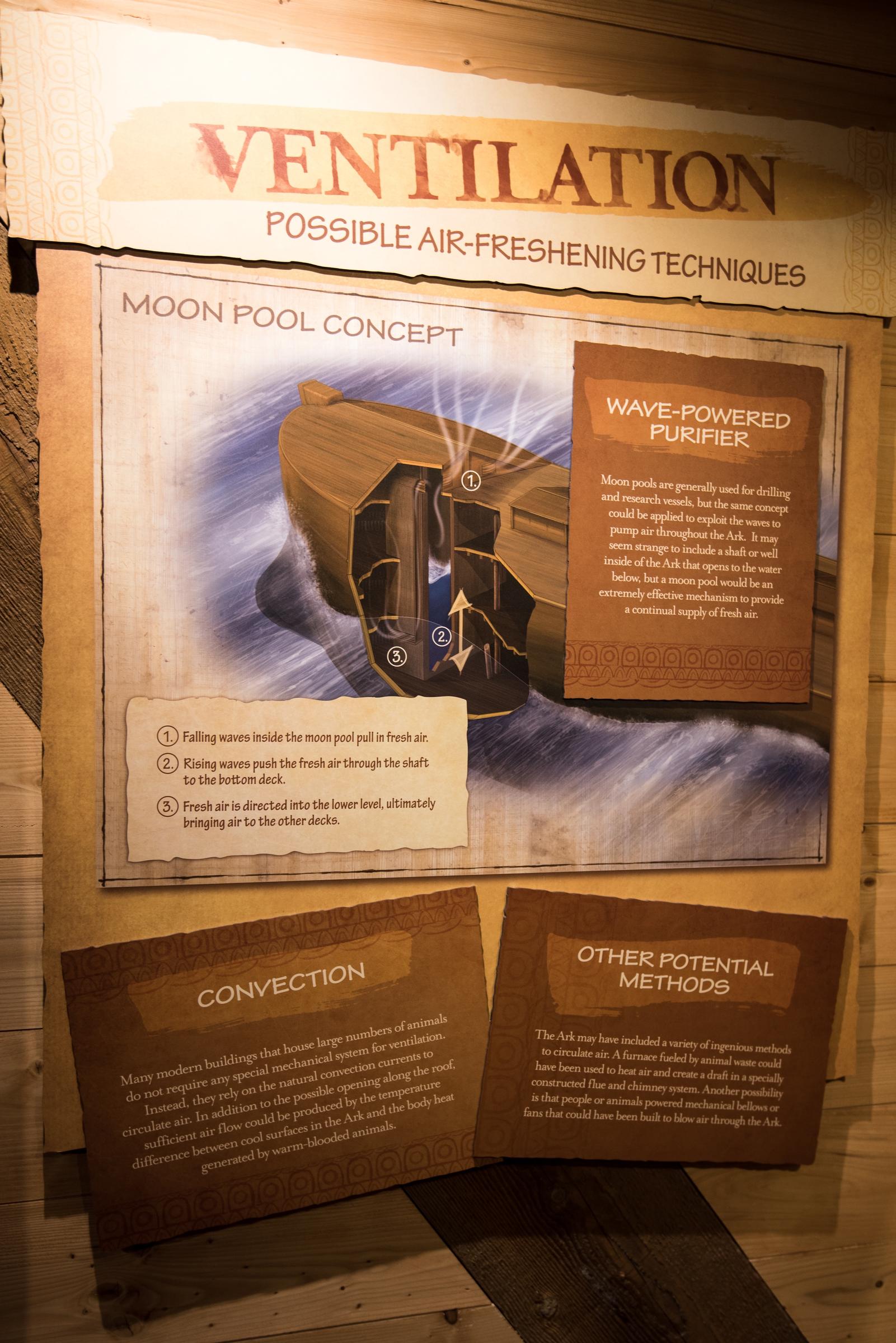 A moon pool, a water chamber opening through the bottom of the hull, provides ventilation as rising and falling waves pull in air from outside. Lighting is provided by oil lamps, candles, torches, and possibly one or more openings in the Ark’s roof.