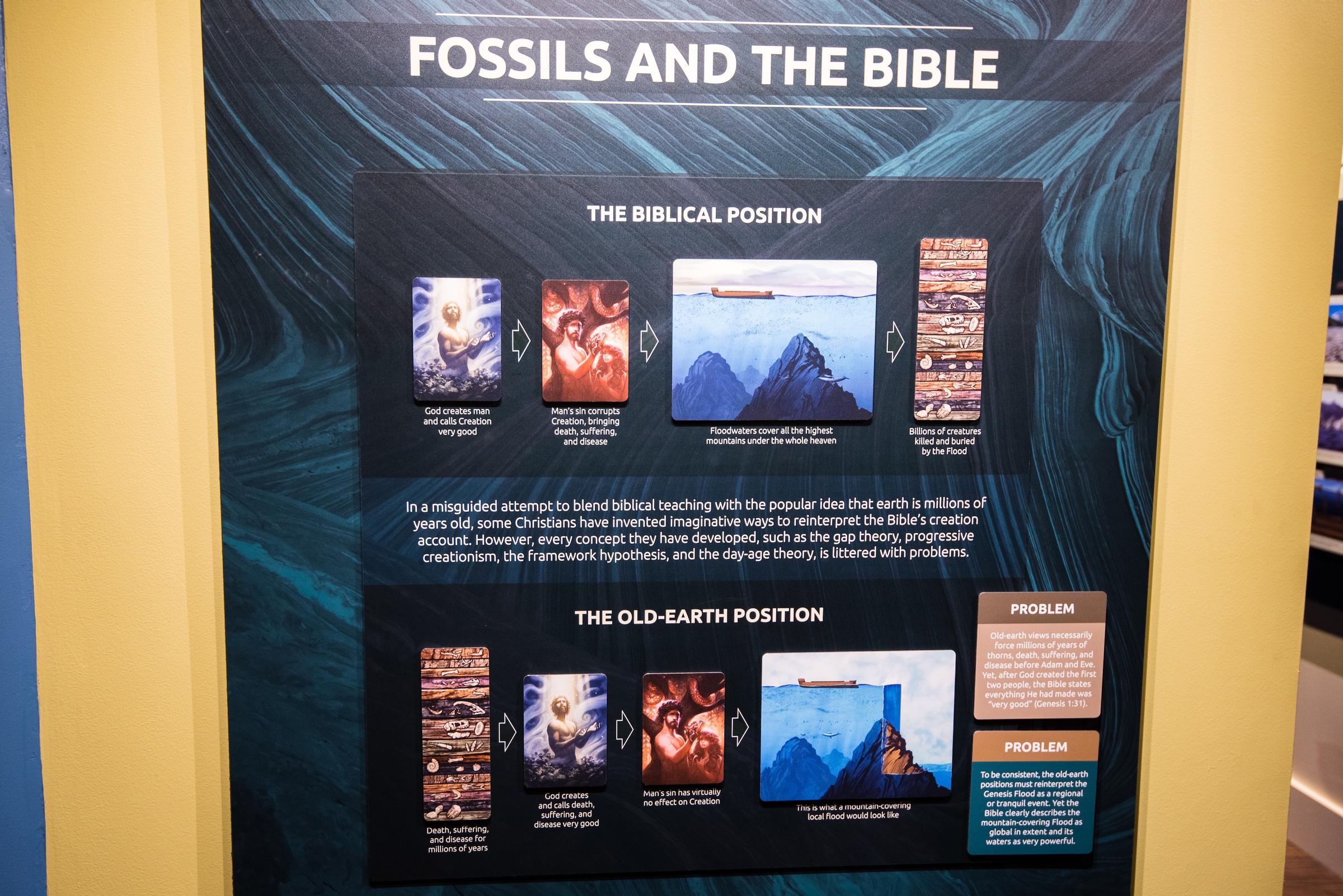 One display depicts what these silly people must believe, if the flood had been local: water covering a mountain, and then just stopping, in mid-air, as if by magic. Obviously that’s just silly, so obviously the Flood had to be global. Also, if the Flood didn’t destroy the entire world, then man’s sin would have virtually no effect on creation, and that would be madness. Basically, the story has to be true because it’s true!