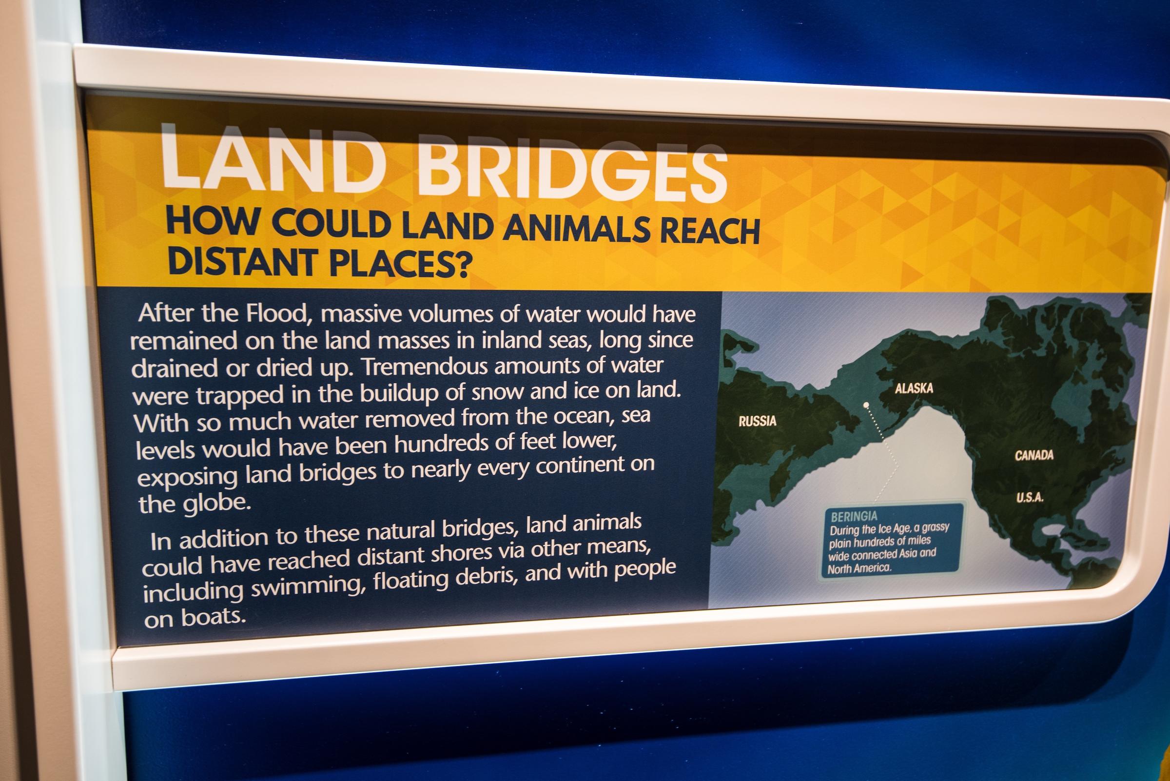 After the Flood, much water was left trapped in inland seas, leaving ocean levels much lower than they are today. Thus, land bridges between continents allowed animals to migrate across the Earth. People were more reluctant to spread out, so we get the Tower of Babel story.